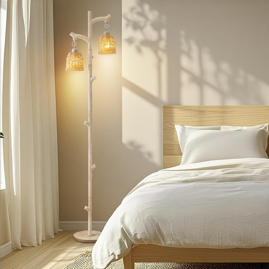 68" Rustic Farmhouse Floor Lamp for Living Room, Country Cottage Tree Trunk Floor Lamp with Wicker Drum Shade Stepless Dimmable, White Washed Resin Tall Standing Lamp for Bedroom Reading Room