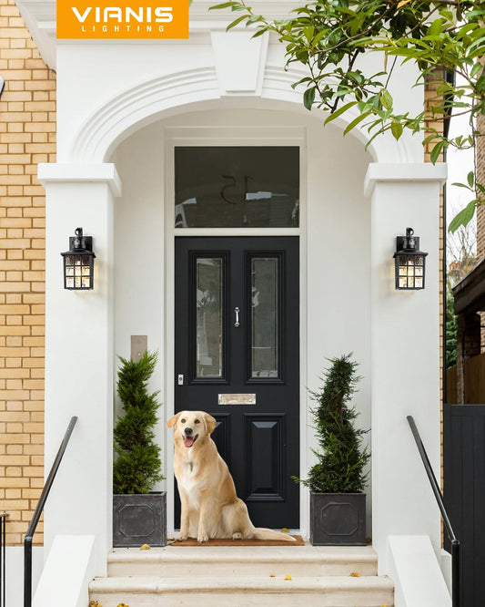VIANIS Outdoor Wall Lights for House, 2 Pack Black Motion Sensor Porch Lanterns Wall Sconce, Modern Exterior Garage Light Fixtures Wall Mount, Waterproof Front Door Lights with Tempered Ripple Glass