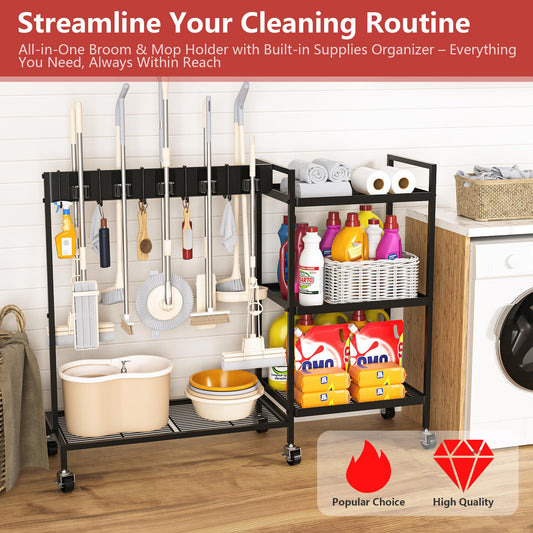 GIOTORENT Metal Cleaning Cart with Wheels - Rolling Broom Holder & Supplies Organizer, 10 Adjustable Clips, 5 Double-Hooks, 3-Tier Shelves, Brakes for Home, Commercial, Black