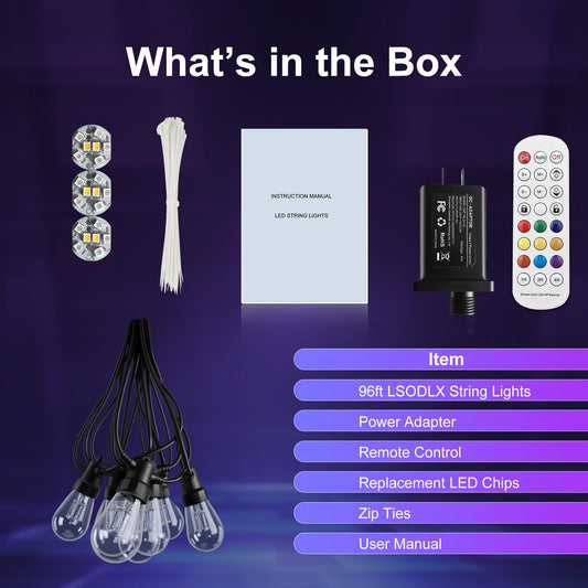 LSODLX Outdoor String Lights 96ft(2×48ft), Patio Lights with 30 Dimmable LED Bulbs, RGBW & Warm White, IP66 Waterproof, Shatterproof, APP & Remote Control, Color Change, Customizable for Backyard