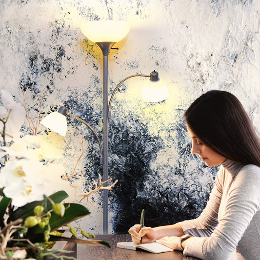 Brightech Sky Dome Double LED Floor lamp, Torchiere Super Bright Floor Lamp with 2 Reading Lamps for Living Rooms & Offices - Dimmable Tall Standing Lamp for Bedroom Reading - Tall Silver Pole