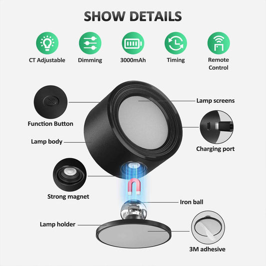 LED Wall Lights, Wall Lamp 3 Color Temperatures & Dimmable Magnetic 360° Rotation with Remote, Wall Sconces 2 Pcs with 3000mAh Rechargeable Battery, Cordless Wall Light for Reading Bedside Hallway