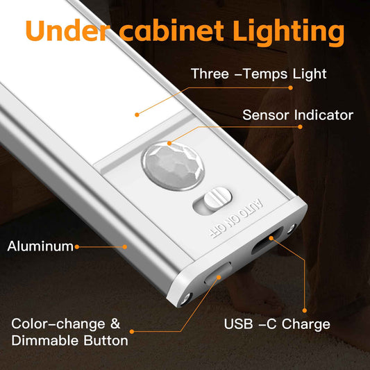 FAXBOX 11.82in Under Cabinet Lighting,with Motion Sensor,LED 3 Color Temperature(3000K/4000K/6000K),Closet Lights Motion Sensored,1800mAh USB-C Charging,Magnetic Mount Options,Home Lamp Decor(2Pack)
