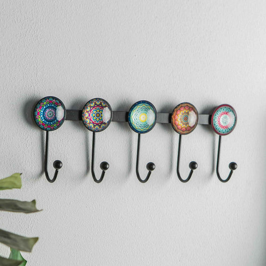 Banllis Boho Coat Rack Wall Mounted with 5 Hooks, Multi-Color Mandala Pattern Decorative Wall Hooks for Hanging Hat, Key, Towel, Purse, Bag, and Robe - for Entryway, Bathroom, and Office