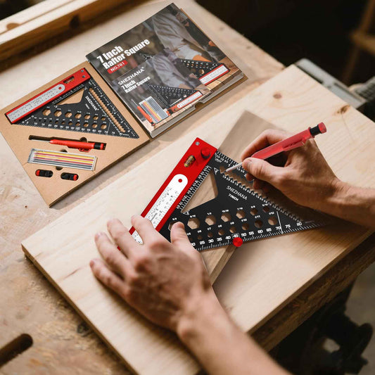 SNEZHANA 7" Rafter Square with Carpenter Pencil and Bubble Level, Multi Purpose Measuring Tool for Precision Woodworking, Roofing, and Framing