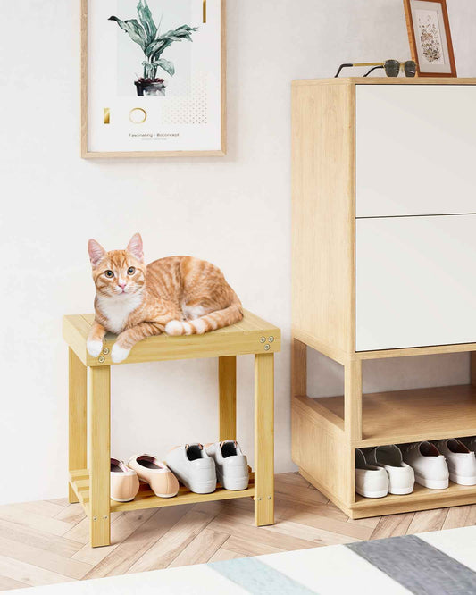 Bamneat Small Bamboo Bathroom Shower Bench with Storage Shelf, Durable Shower Stool for Shaving Legs, Indoor and Outdoor Use, Natural