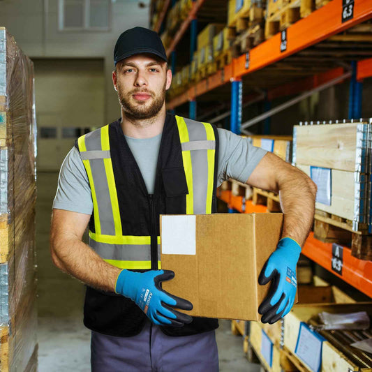 KAYGO Safety Work Gloves PU Coated for Men and Women, KG11P 12 Pairs Seamless Knit Glove with Two Fingers Touchscreen,Ideal for General Duty Work (Blue,M)
