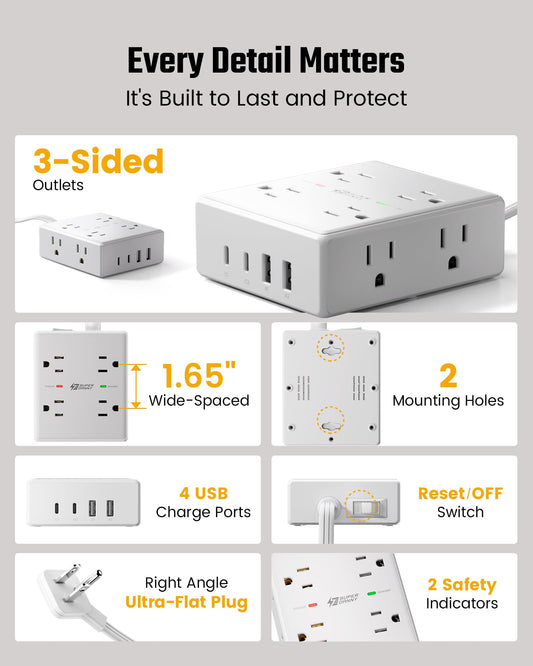10Ft Extension Cord with Multiple Outlets, Flat Plug Surge Protector Power Strip 10 Ft Long Cord, 8 Outlets & 4 USB Ports (2 USB C), Desk Charging Station for Home Office, College Dorm Room Essentials
