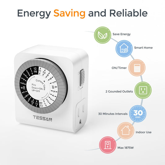 TESSAN Outlet Timer, Mechanical 24-Hour Light Timers for Electrical Outlets Indoor, Dual 3-Prong Sockets 30-Minute Intervals, for Lamps, Christmas Lights, Fans (1 Pack)