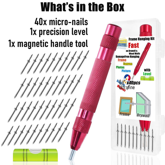Quick Picture Hanging Tool Kit with Magnetic Handle & Level – Secure on Drywall/Wood Walls in Seconds – for Canvas, Photos, Wood Frames (40 Nails)