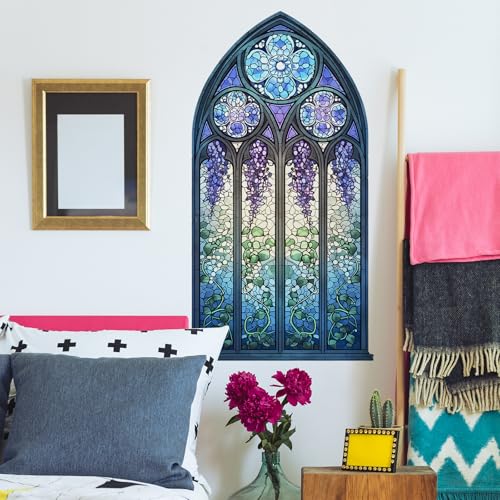 Fake Window Wall Decals Removable Vinyl Wisteria Stickers for Kitchen Dining Room Living Room Vintage Decor Peel and Stick Wall Art