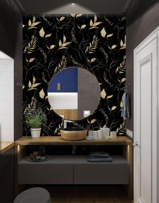 Akodm Black and Champagne Gold Leaf Wallpaper Peel and Stick Botanical Vintage Contact Paper for Cabinets Drawers Bathroom Removable Self Adhesive Thick Vinyl Waterproof Luxury Wallpaper 17.7"x70.8"