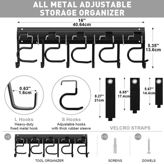 LEYU Metal Garage Tool Organizer Wall Mount, 2 Pack Garden Tool Organizer With Extension Cord Straps, Garage Organization Hooks and Hangers for Shed, Yard Storage, Wall Holder for Hanging Broom Mop