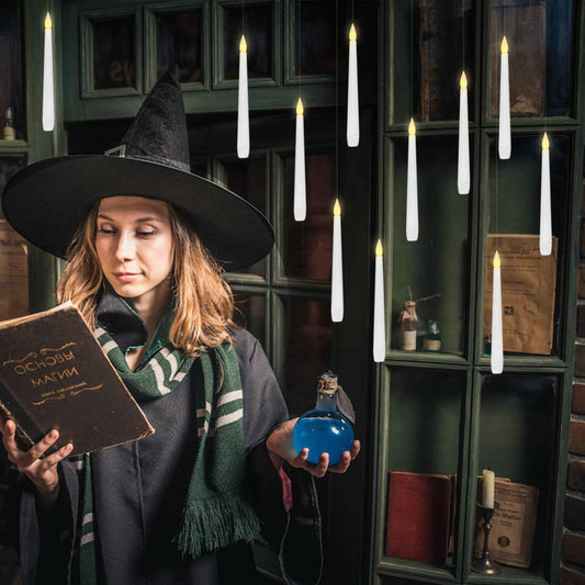 Eebuss Flameless Floating Candles with Magic Wand, 12 Pcs Hanging Flickering LED Taper Candles, Battery Operated Taper Candle with Remote for Children Gift Halloween Decor (White)