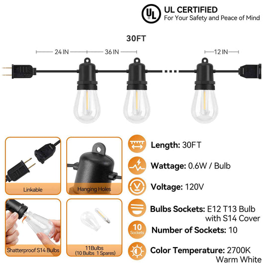 Adirxon 30FT LED Outdoor String Lights Dimmable Shatterproof S14 Bulbs IP44 Weatherproof Hanging Lights for Small Patio Balcony Tent DIY Project