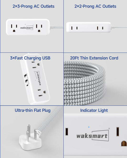 Flat Plug Extension Cord 20 FT with 4 AC Outlets 3 USB Ports (5V/3.4A 17W), 20Ft Long Braided Cord for Home Office College Dorm
