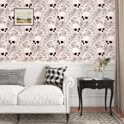 Gothic Wallpaper Skulls Ferns Peel and Stick Wallpaper Beige Brown Halloween Contact Paper for Bedroom Bathroom Living Room Cabinets 17.5"x102" Removable Waterproof Skulls Art Decor Mural