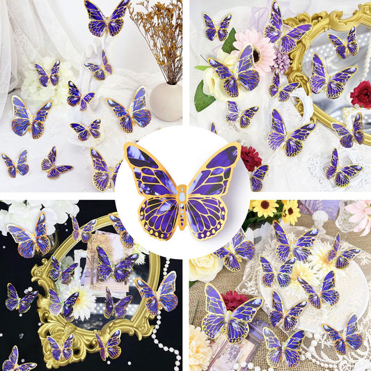 Buiory 36pcs Removable DIY 3D Colorful Butterfly Wall Decor Gold Side Butterflies Wall Decals Flower Butterfly Wall Sticker Home Art for Kids Baby Girls Teens Bedroom Living Room Nursery (Purple)