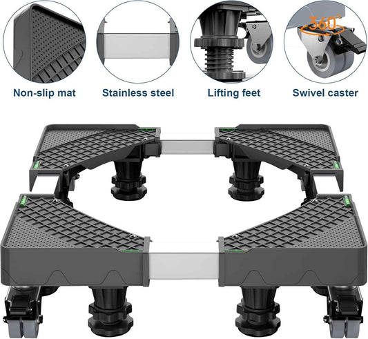 Adjustable Mobile Fridge Stand with 8 Locking Wheels & 4 Strong Feet - 27.5” to 35.4” Washer Dryer Dolly (Black)