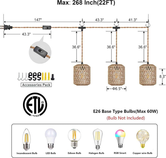 Boho Rattan Pendant Light with 3 Bulbs & 22ft Cord - Woven Hanging Chandelier for Bedroom, Kitchen, Hallway