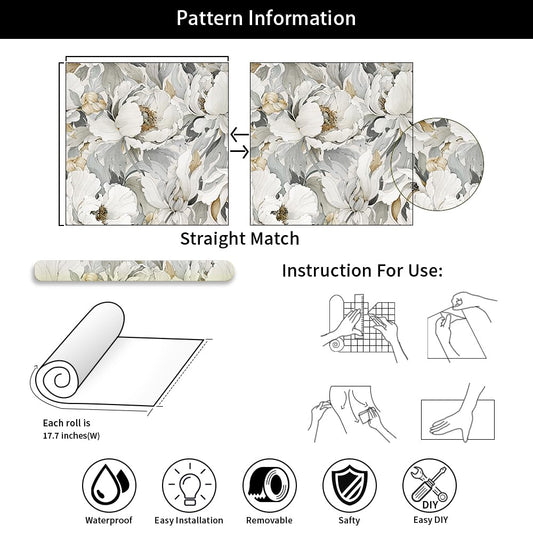 MuralPeel White Poppies Floral Modern Grey Peonies Flowers Peel and Stick Wallpaper Self Adhesive Removable Easy Peel Off Stick on Wall Paper for Bedroom Renter