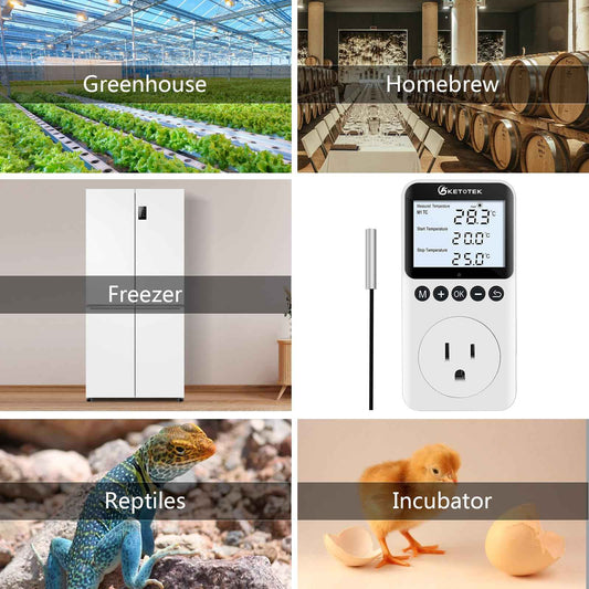 KETOTEK Plug in Thermostat Timer Temperature Controller Outlet with Backlight, Day/Night Thermostat Outlet Plug with Sensor for Reptile Terrarium Greenhouse, Digital Heating Cooling Temperature Switch