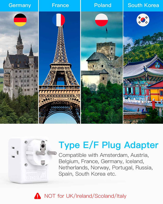 2 Pack Germany France Travel Plug Adapter with 3 Outlets 1 USBA 2 USB C, One Beat Type E/F International Power Adapter, Travel Essentials US to Europe France Germany South Korea Netherlands