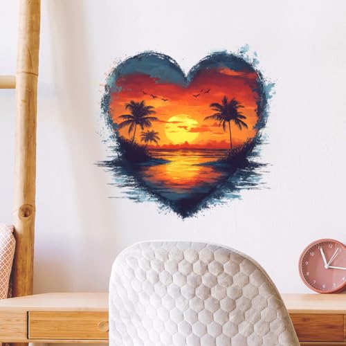 Heart Sunset Beach Wall Decals Removable Watercolor Tropical Palm Trees Vinyl Stickers for Living Room Bedroom and Bathroom Sea Decor Peel and Stick Wall Art