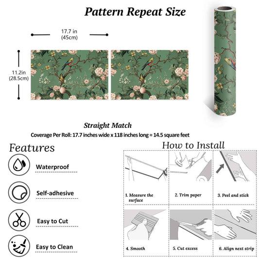 VEELIKE Vintage Green Bird Wallpaper Peel and Stick Chinoiserie Floral Wallpaper Removable Prepasted 17.7''x118'' Green Floral Wall Mural Self Adhesive Renter Friendly Wall Deco for Bedroom Bathroom