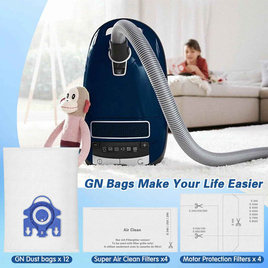 12 Pack 3D Airclean Dust Bags Compatible with Miele GN Vacuum Cleaner Bags for Classic C1 Complete C2 Complete C3 S2 S5 S8 S400i S600 S800 Series with 4 Motor Filters, 4 Exhaust Filters