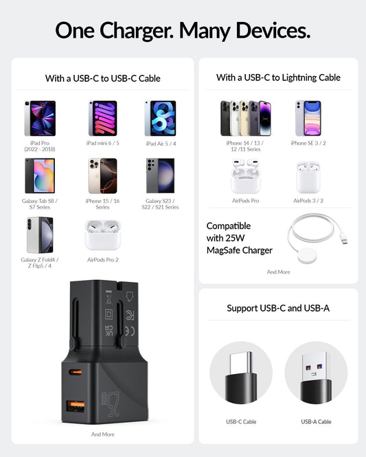 SooPii Gan USB C Charger 25W, 2 Port PD PPS QC Universal Travel Adapter, All-in-One Travel Charger with US UK EU AU Plug Adapter for Galaxy S25/S24/Note 20, iPhone 16/15/14, iPad, Pixel and More