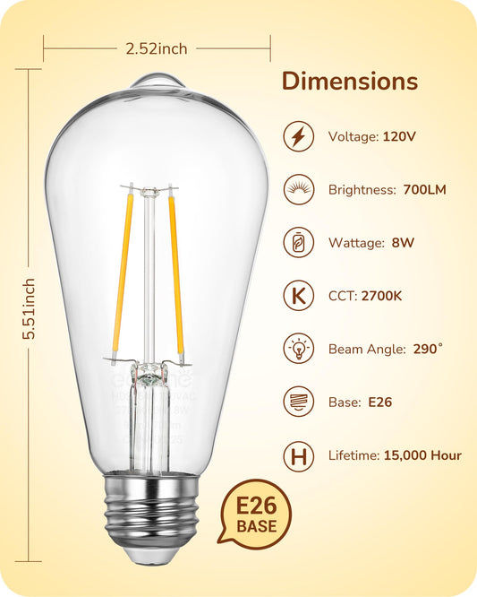 EDISHINE Dusk to Dawn LED Light Bulbs, 8W Equivalent 60W, Vintage Styled ST64 LED Edison Bulbs, 700LM Extra Bright 2700K Warm White for Outdoor Wall Sconce, E26 Base, 6 Pack, UL ListedRegular price $25.95 USDRegular priceUnit price / per$51.99 USDSale price $25.95 USDSale