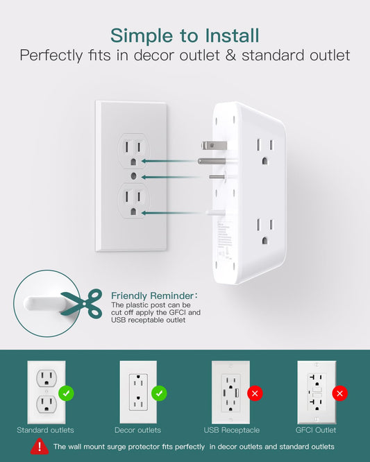 Addtam Surge Protector Outlet Extender, 6-Outlet Splitter with 4 USB Wall Charger(PD 20W), Multi Plug Wall Outlet 1800J Power Strip for Home Office Dorm Room Essentials