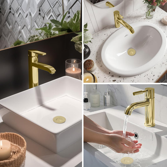 Hibbent Upgraded 3 in 1 Bathroom Sink Drain Strainer, Universal Pop Up Stopper with Removable Stainless Steel Filter Basket Hair Catcher, Sink Plug for 1.1''~2.36'' Basin, Brass Core, Brushed Gold