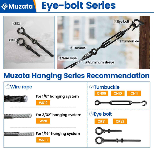 Muzata 10 Pack 1/4" x 3" Black Eye Bolt with Nuts T316 Stainless Steel Eye Bolts Heavy Duty Threaded Eyebolts Shoulder Lifting Ring Marine Grade UNC-3A CR31