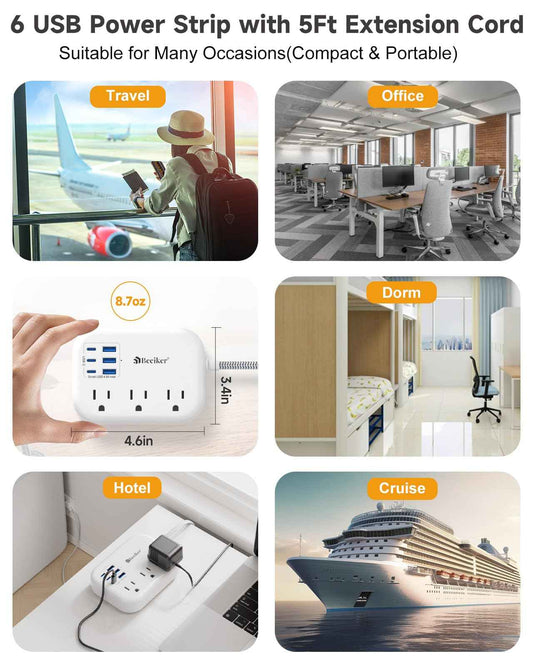 6 USB(3 USB C) Power Strip- Travel Power Strip with 6 USB Desktop Charging Station 24W/4.8A and 3 Outlets, 5Ft Flat Plug Braided Extension Cord, Non Surge Protector for Cruise Ship Travel Office Dorm