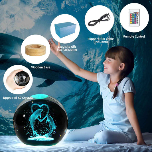ZXBLAQ 3D Dolphin Crystal Ball Night Light, Upgraded 3.15 Inch Glass Ball Lamp with 16 Color LED Wooden Base, Dolphin Decor Birthday Holiday Christmas Gifts for Boys Girls Friends