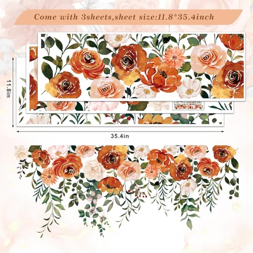 Fall Flower Wall Stickers Large Boho Watercolor Floral Leaves Wall Decals Removable Vintage Room Mural Stickers for Autumn Home Party Bedroom Living Room Decor, 11.8 x 35.4 Inch, 3 Sheets