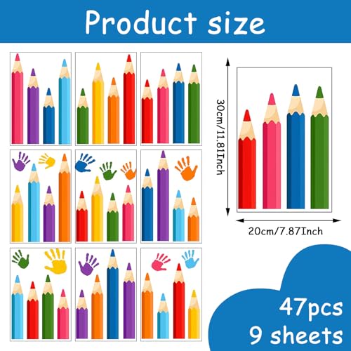 Colorful Pencils Wall Decals Removable Peel and Stick Window Clings 9-Sheet Set with Handprint, Colored Pencil for Back to School, Kids Room, Nursery Classroom, Playroom Decor
