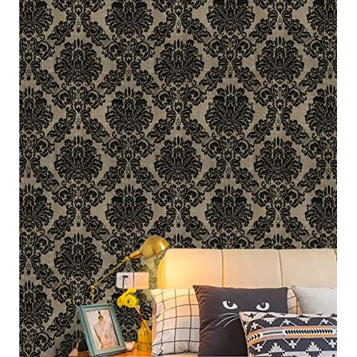 JLHOUSE Vinyl Victorian Damask Wallpaper Stick and Peel - self Adhesive Wallpaper Brown/Black Removable Paper for Bedroom Living Room Walls -17.7inch x 118inch/Roll