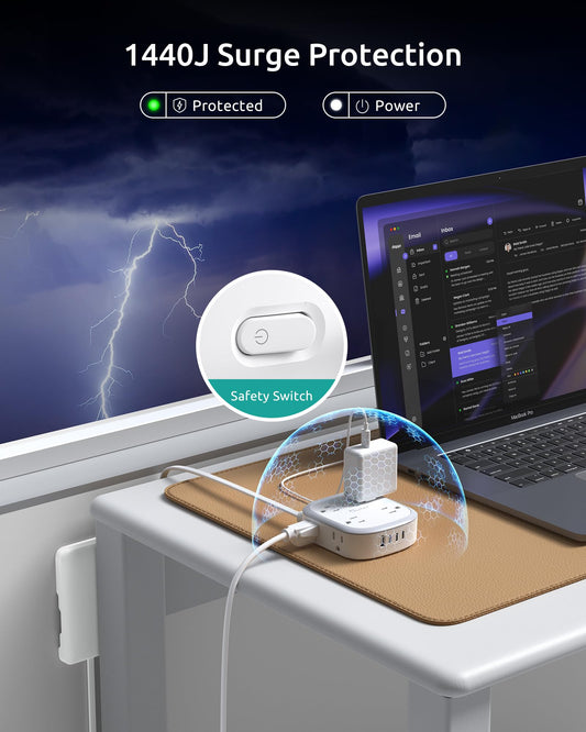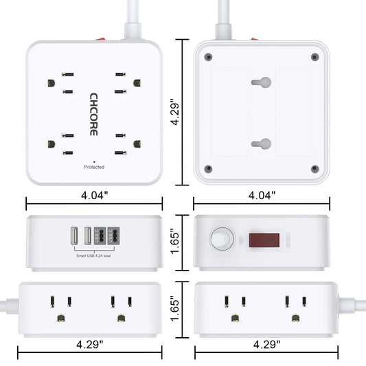 10Ft Surge Protector Power Strip - CHCORE Flat Plug Extension Cord with 8 Outlets and 4 USB Ports(2 USB C), 3 Side Wall Mount Outlet Extender for Home Dorm Room Essentials, ETL Listed, White