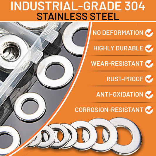 Stainless Steel Flat Washers Assortment Kit, SAE 304, 300-Piece Metal Screw Washers Set for Bolts, 8 Sizes #6; #10; #12; 1/4"; 5/16"; 3/8"; 1/2"