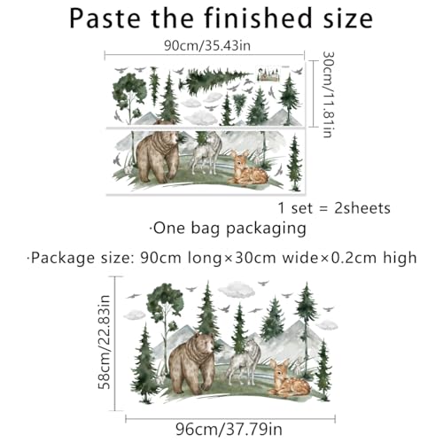 Large Green Tree Forest Wall Decals 3D Jungle Wild Animals Wall Stickers DIY Peel and Stick Watercolor Woodland Safari Bear Wolf Deer Mountain Trees Decor for Kids Boys Bedroom Living Room Nursery