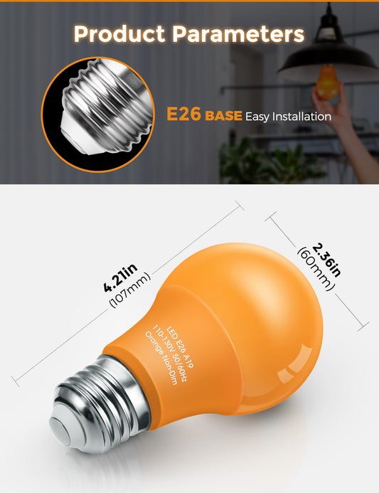 DORESshop Orange LED Light Bulb, 60W Equivalent, 720 Lumens, A19, E26 Base, Energy Efficient, Long-Lasting Colored Light Bulb for Halloween Decorations, Parties, Mood Lighting, Non-Dimmable, 2 Pack