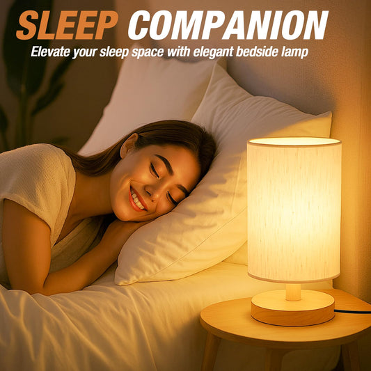 EZIYIN Desk Lamp LED Bulb Included, Small Bedside Table Lamp Plug-in - Classic Wood Base with Flaxen Fabric Shade, Lamps for Night Stands, Simple Nightstand Light for Bedroom, Office, Desk