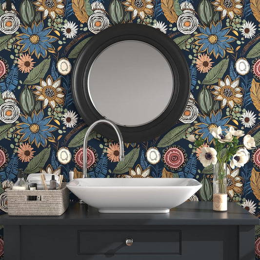Peel and Stick Blue Boho Wallpaper - Vintage Floral Self-Adhesive 17.5" x 393.7" for Walls & Decor