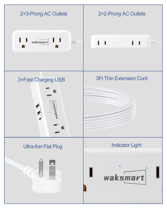 Flat Plug Extension Cord 3 Feet with 4 AC Outlets 3 USB Ports (5V/3.4A 17W), Flat Plug Power Strip Compact for College Dorm, Travel, Home, White