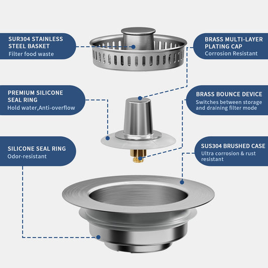 3-in-1 Stainless Steel Kitchen Sink Drain Strainer – Pop-up Sink Stopper with Sealing Ring, Anti-Clog & Odor-Proof Drain Filter, Fits 3-1/2 Inch Sink Drain Holes, Easy Installation