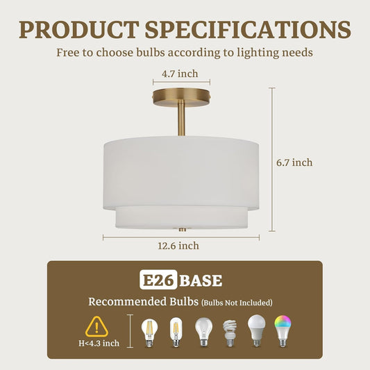 Modern Gold Semi Flush Mount Ceiling Light Fixture - 12.6'' Farmhouse Drum Design with 2-Layer Linen Shade for Bedroom & Hallway