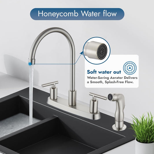 Brushed Nickel Kitchen Faucet with 360° Rotating Spout & Side Sprayer - 2 Handle, 8 Inch Centerset